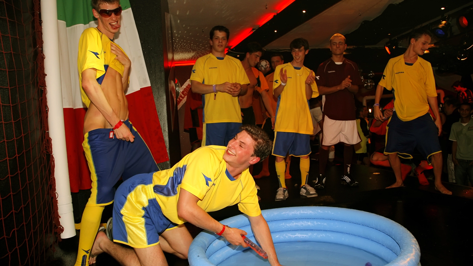 Join us while the latest Guys Go Crazy party is well underway and our horny guys are dancing the night away. Our cameraman spots a lone guy sitting on the floor with his big cock out, stroking himself and that's when the real fun begins! A guy is bent over with his ass in the air while wanking while another playfully slaps his ass, admiring the...